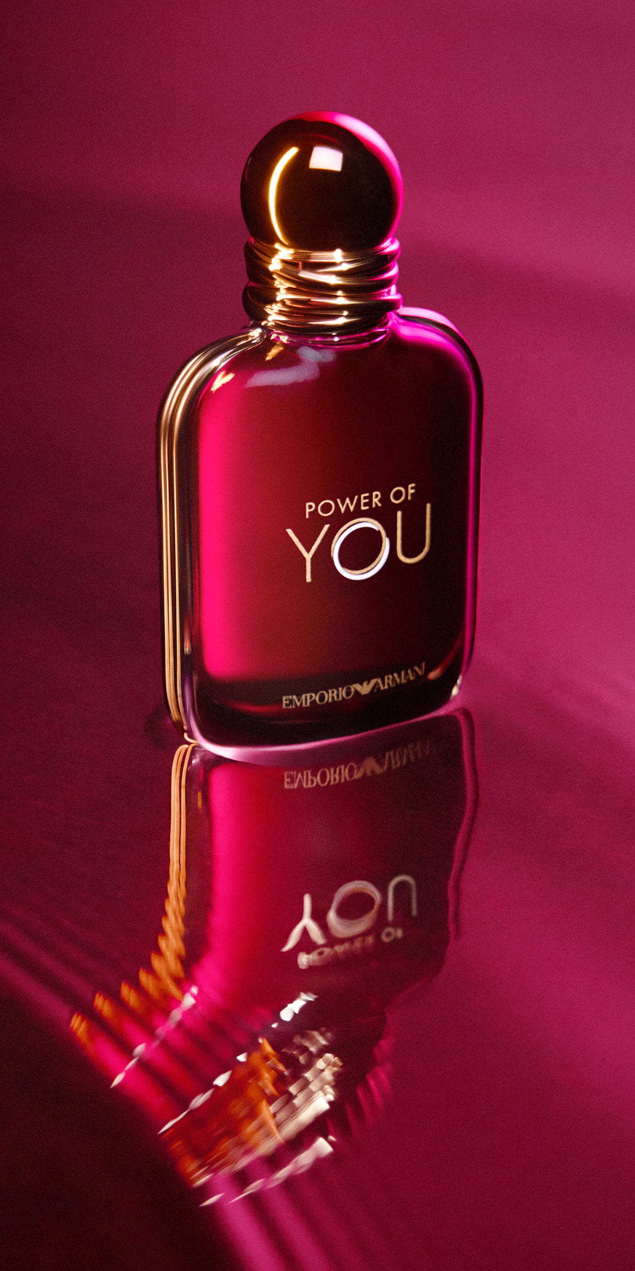 Predstavljamo novu kultnu bočicu za odvažan novi miris: dragulj rubinske boje, pomno izrađen kako bi utjelovio blistavu energiju Power of You — pravi komad mirisne izjave. Njegova elegantna, profinjena silueta u prozirnom staklu prekrasno ističe živahni, rubinski obojeni sadržaj, dok njegov unutarnji sjaj kao da zrači iz same jezgre. Dragocjenu bočicu elegantno pojačava upečatljiv okvir od žutog zlata koji graciozno okružuje njezine konture, besprijekorno prelazeći u odgovarajući čep od žutog zlata. Ovaj blistavi čep, ukrašen pomno teksturiranim, isprepletenim prstenovima, evocira slavlje zajedništva — jedinstven simbol koji je središnji dio vrijednosti mirisa Emporio Armani.