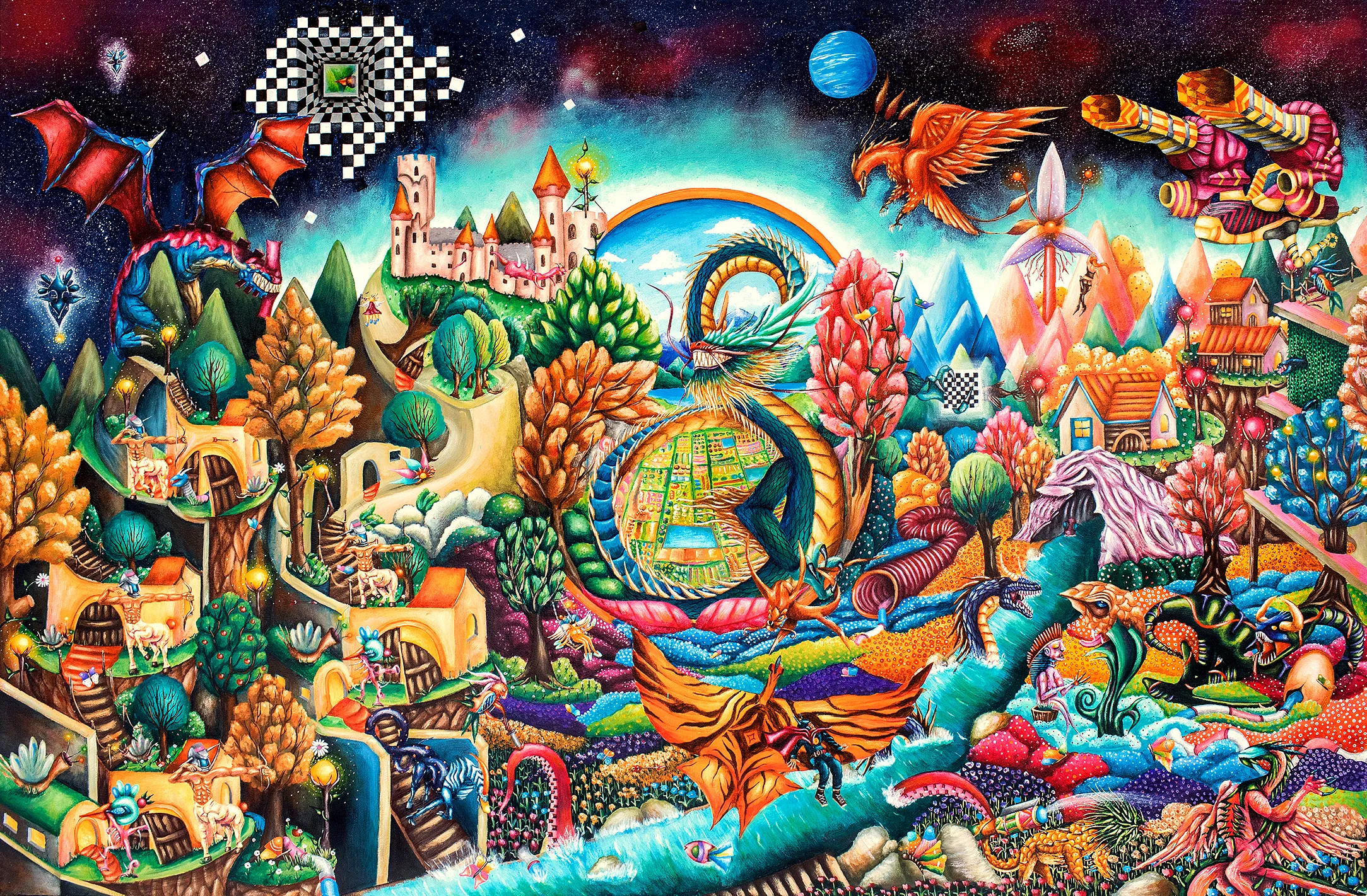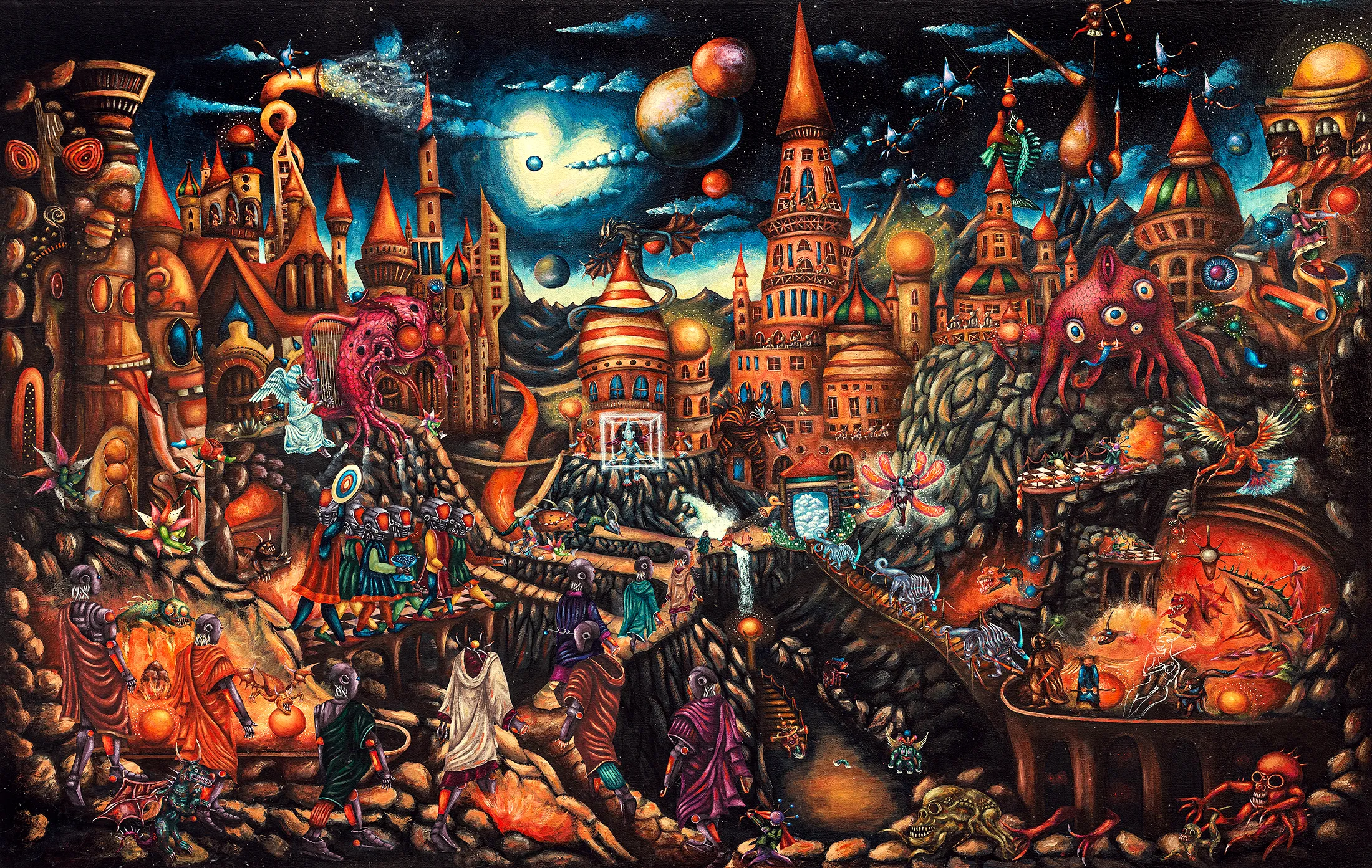 Umjetnost je pravljenje kosmičkih mašina. Još u srednjoj školi usvojila sam ovu definiciju umjetnosti koja me i danas vodi kao misaoni kompas — koja je oblikovala moje profesionalno shvatanje umjetničke prakse. Ta formulacija, naizgled metaforična, s vremenom se pokazala kao izuzetno relevantna za razumijevanje umjetničkih sistema koji ne operiraju samo na nivou reprezentacije, nego proizvode vlastite ontologije, vlastite mehanizme smisla. Tek rijetki umjetnički opusi zaista ostvaruju takvu vrstu operativne kompleksnosti. U ciklusu XANTEA 2502 Rikarda Druškića susrećemo upravo to — konstrukciju zatvorenog, ali dinamičkog kozmičkog modela, u kojem su simboli, arhetipske strukture, projekcije i procesi koji se međusobno sudaraju, spajaju i transformišu. Integrirani u jedinstveni konceptualni mehanizam. Xantea nije isključivo imaginarna galaksija, nego laboratorij u kojem umjetnik gradi novi mehanizam značenja kako bi se suprotstavio raspadu značenja u vlastitoj stvarnosti.