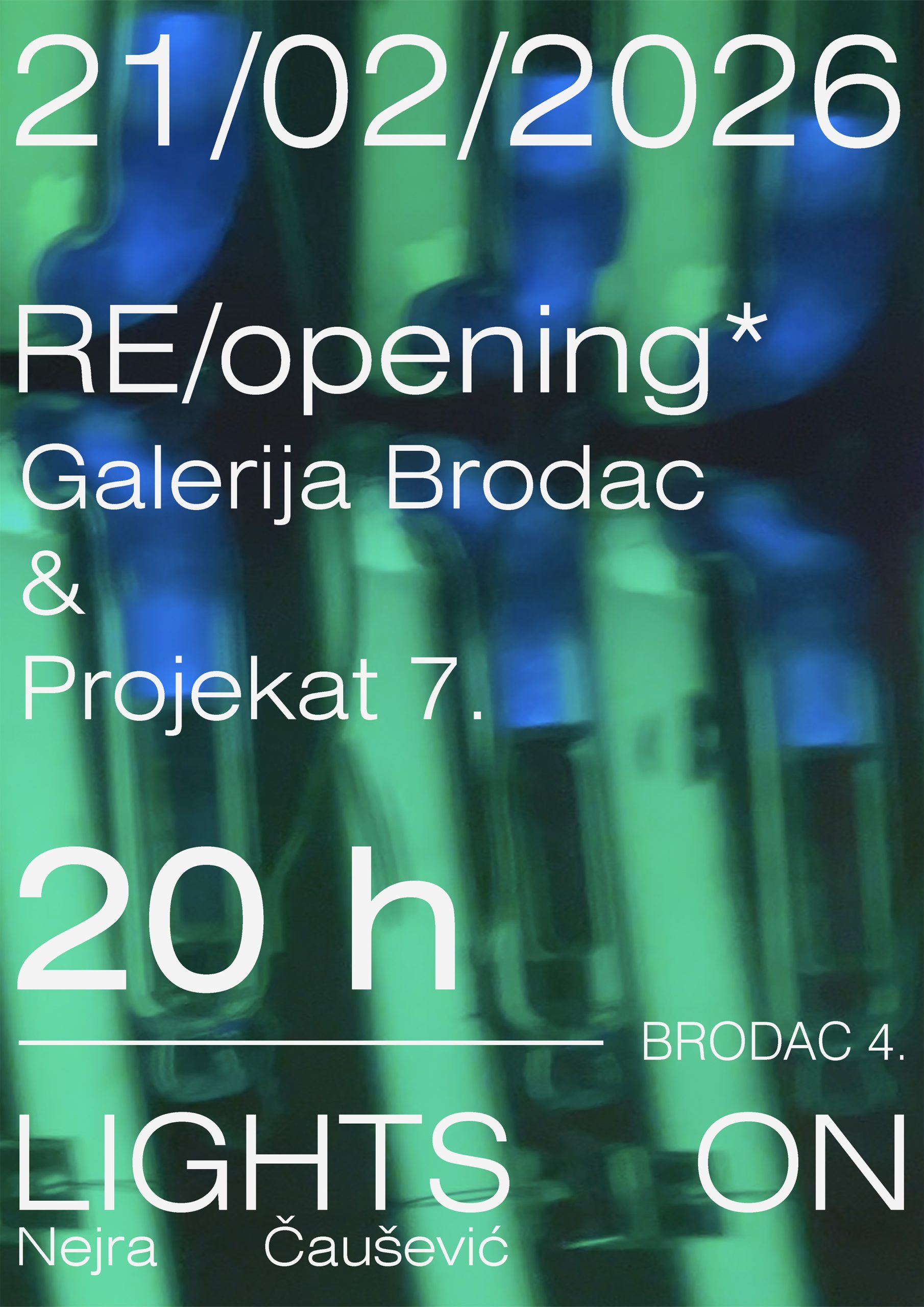 U subotu, 21. februara, s početkom u 20 sati otvorenjem izložbe LIGHTS ON, nastupa nova era Galerije savremene umjetnosti Brodac, nakon četiri godine pauze u radu. Izložba LIGHTS ON označava i zvanični početak Projekta 7 koji ima za cilj oživljavanje Galerije Brodac, njezino vraćanje na kulturnu mapu grada, realizacijom niza izložbi i umjetničkih projekata. Ulaz na izložbu je slobodan.