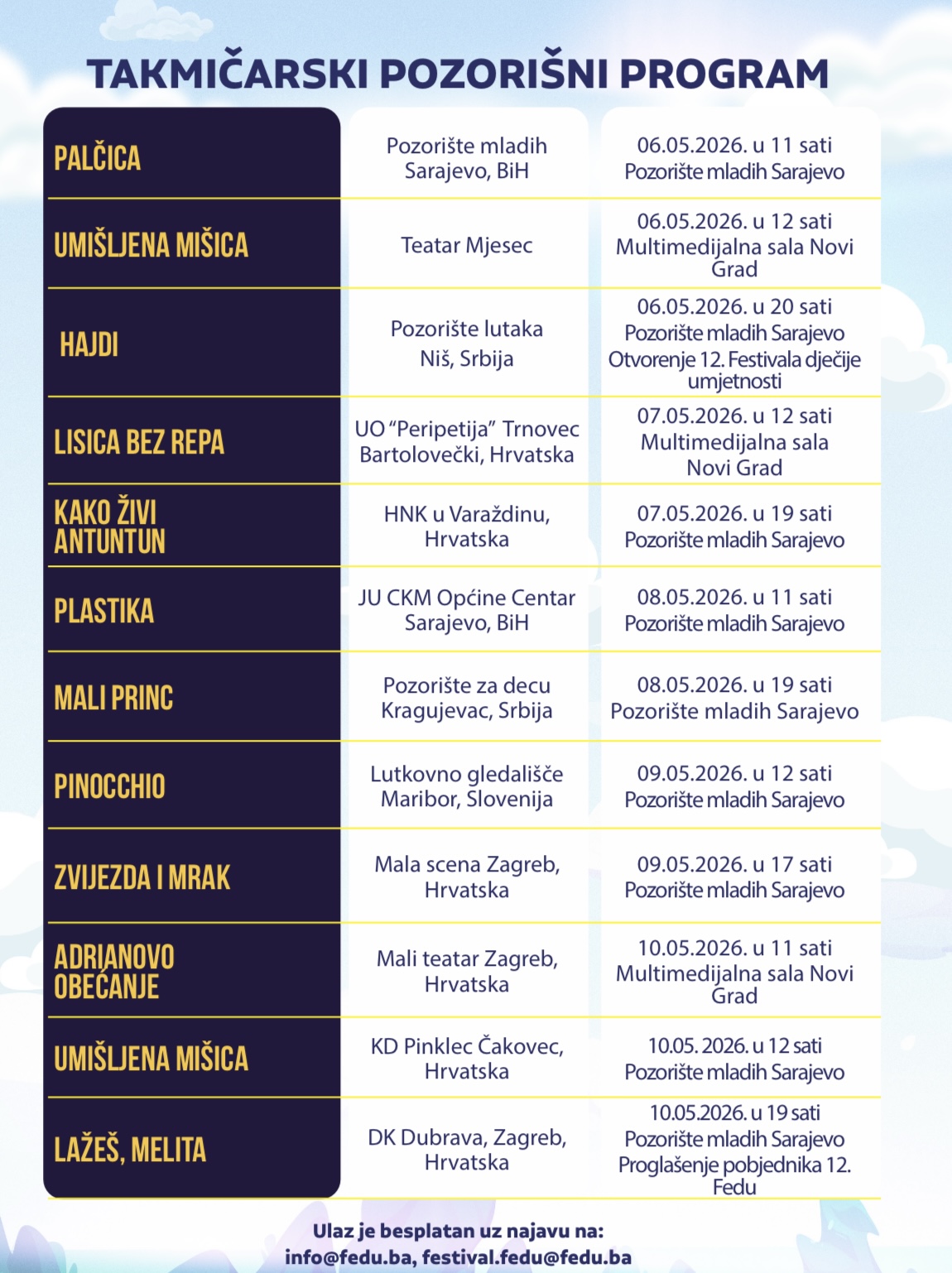 Oni koji žele gledati predstave karte mogu rezervisati putem mail adrese info@fedu.ba.